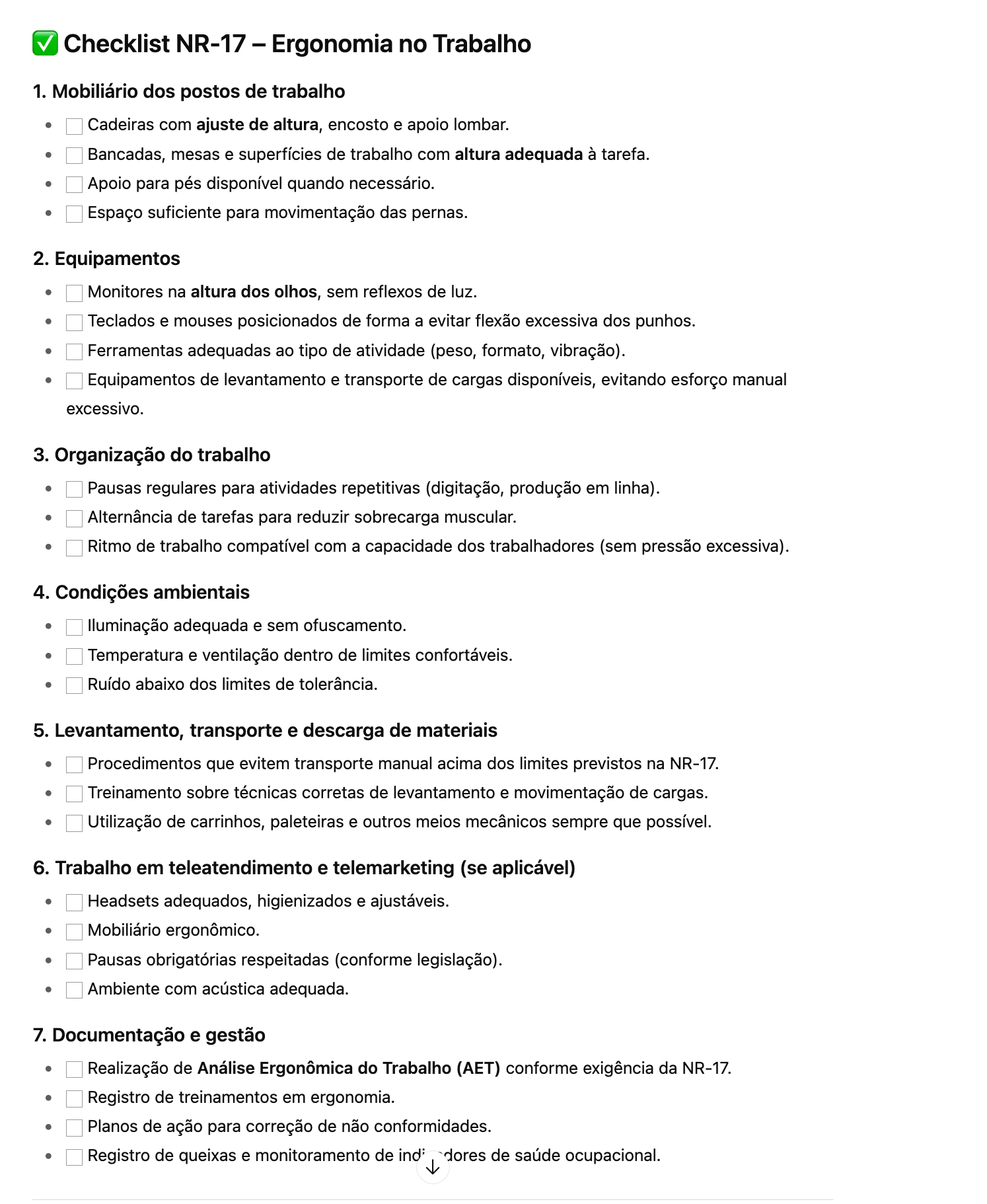 A NR-17 (Norma Regulamentadora de Ergonomia) foi criada para garantir que as condições de trabalho estejam adequadas às características psicofisiológicas dos trabalhadores. Ela orienta empresas a ajustar mobiliário, equipamentos, organização do trabalho e condições ambientais para reduzir riscos à saúde e melhorar a produtividade.